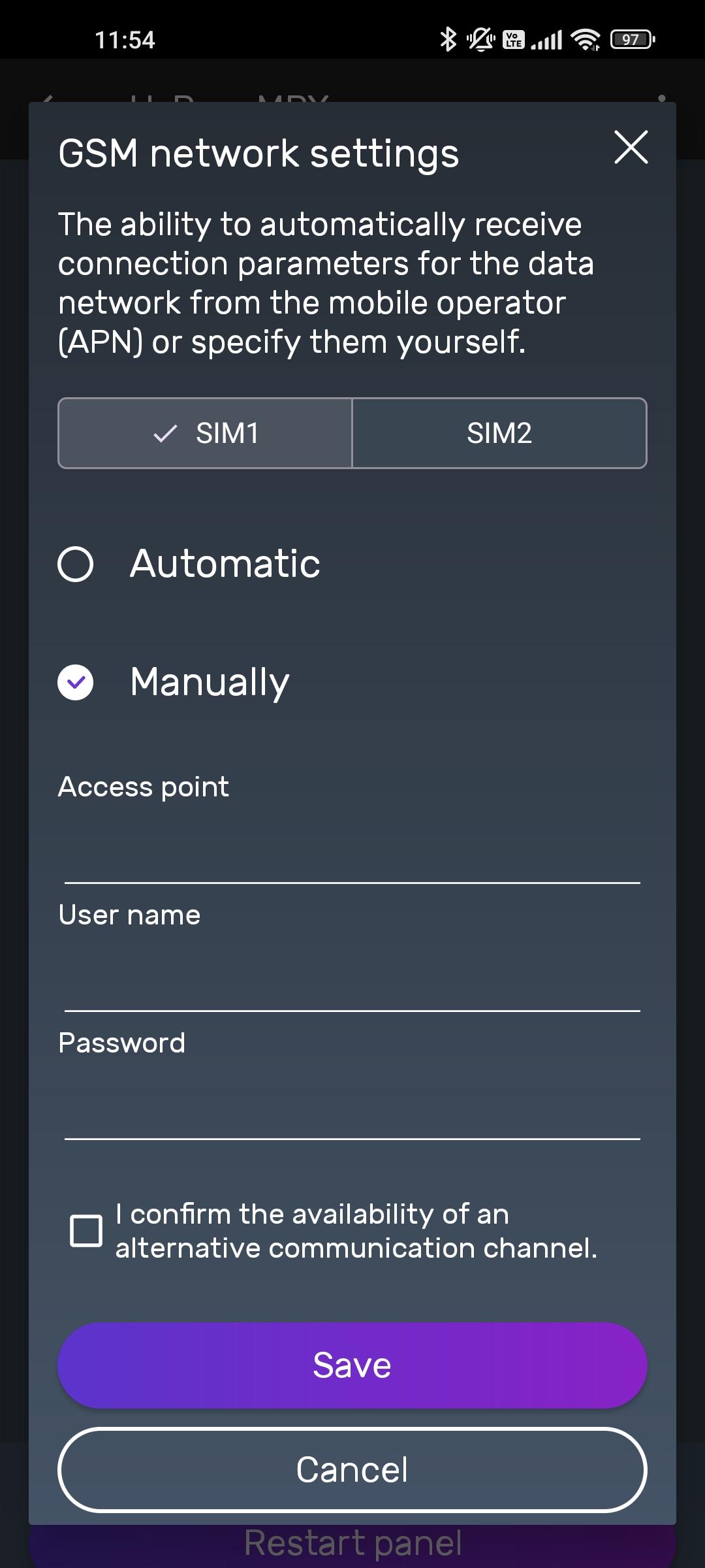 Since the backup communication source is the LTE/GSM network (the mobile operator card is installed).