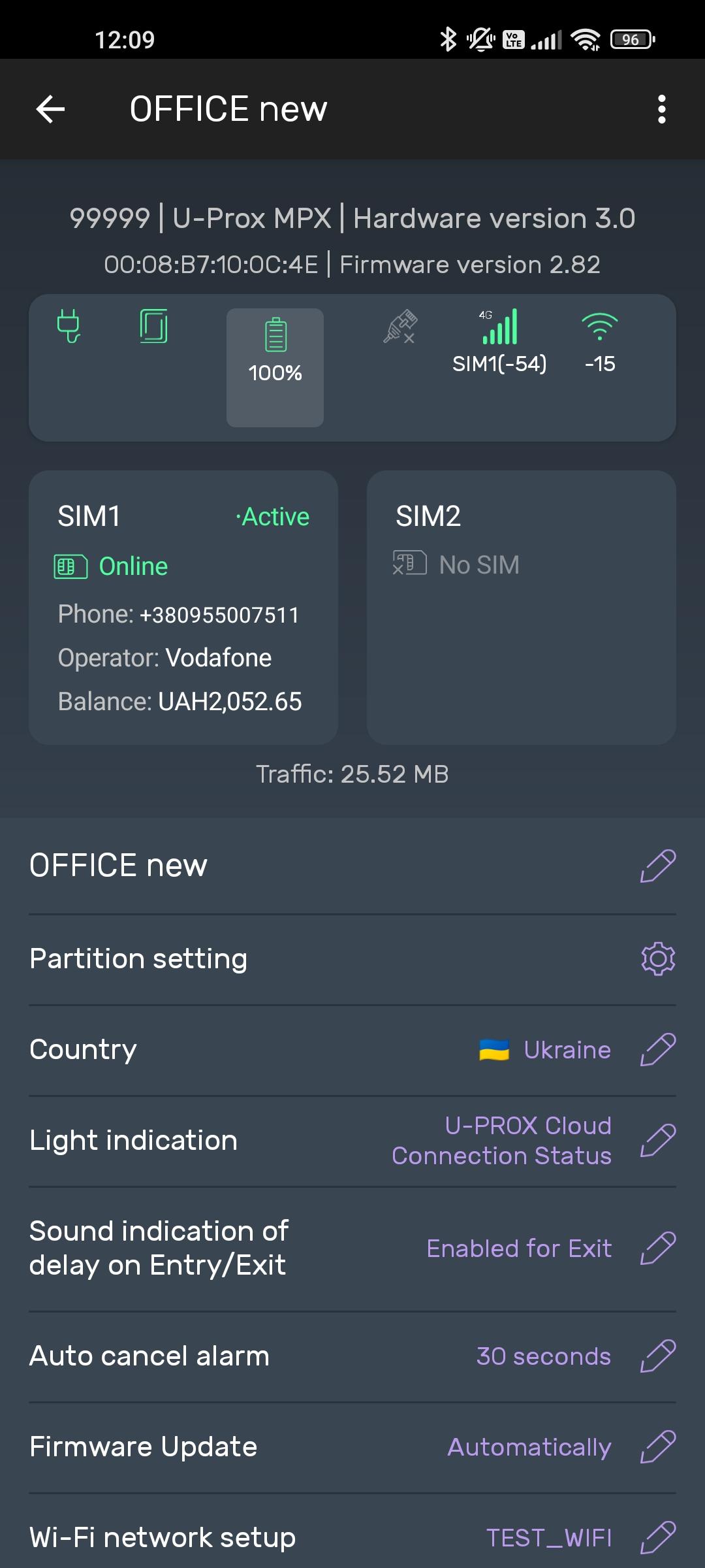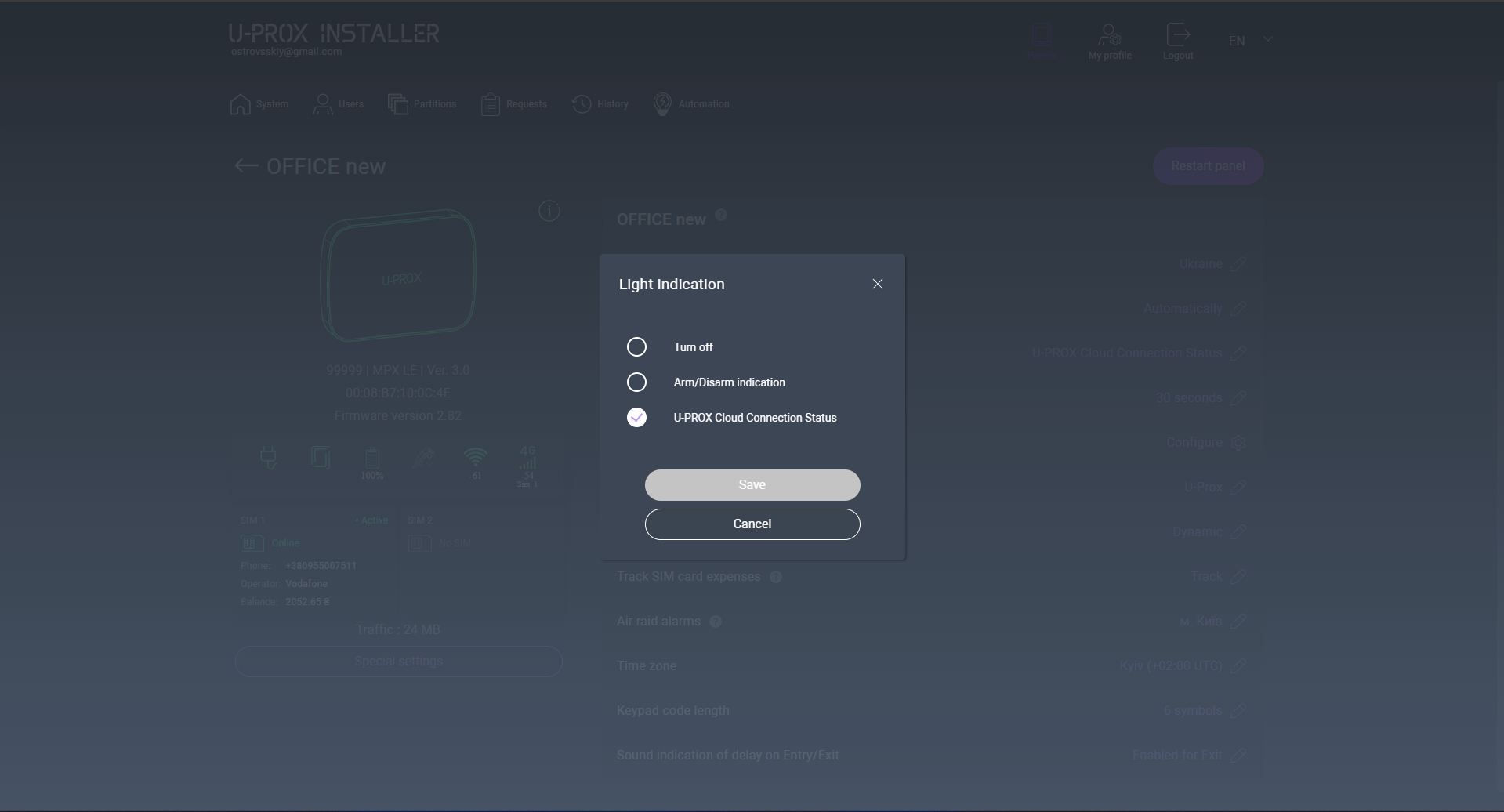 • Cloud connection status – displays the connection status to U-PROX Cloud:
