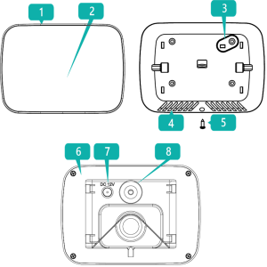 1. Корпус пристрою 2. Світловий індикатор 3. Відривна пластина тамперу 4. Отвори резонатора 5. Фіксуючий гвинт 6. Задня кришка корпусу 7. Підключення блоку живлення 8. Кнопка ввімкнення/вимкнення |